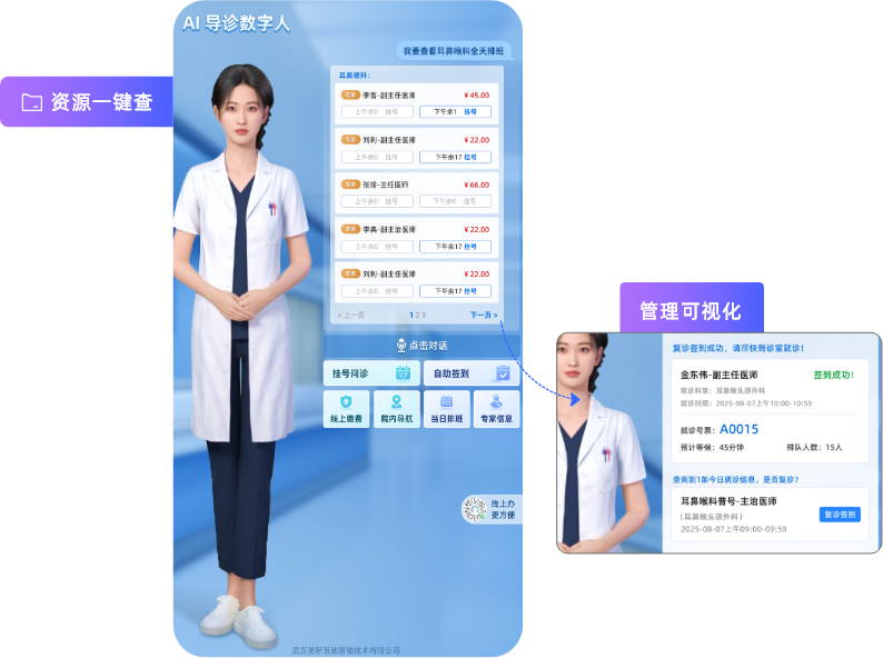 为医院管理员提供后台数据看板,实时监控各科室人流密度、设备排队情况、高频问询问题等,为院内资源调度、流程优化提供数据支撑。